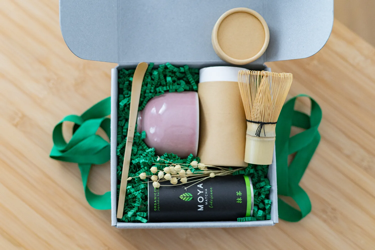 - Chasen – bambusowa miotełka do mieszania matchy, zapakowana w tekturową tubę.