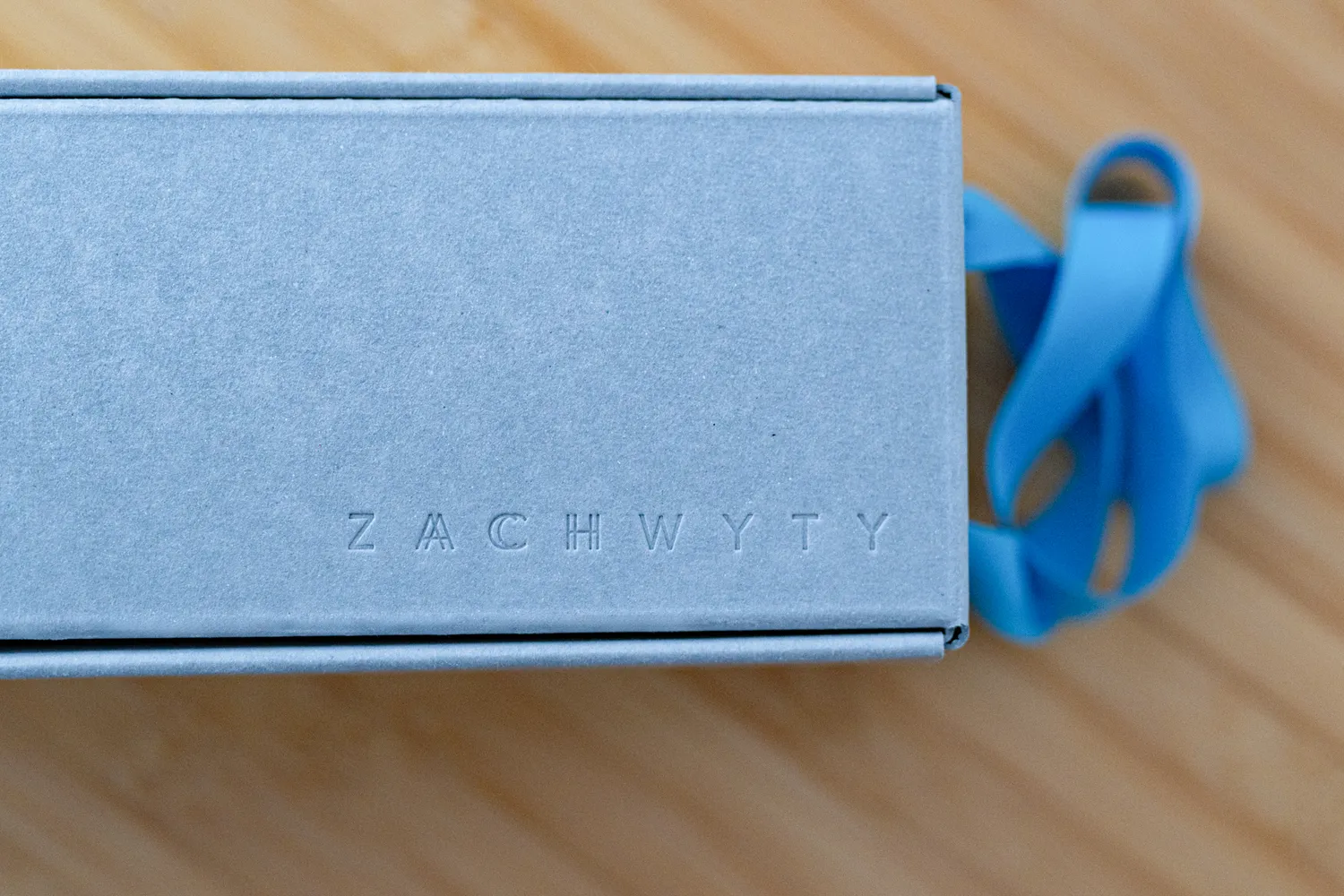 Nasze pudełko na wieku ma wytłoczony napis Zachwyty (które, mamy nadzieję, będą towarzyszyć przy wręczaniu tego upominku!) oraz granatowe uchwyty do przenoszenia – dzięki temu funkcjonalnemu rozwiązaniu nie potrzebujesz dodatkowych toreb prezentowych.