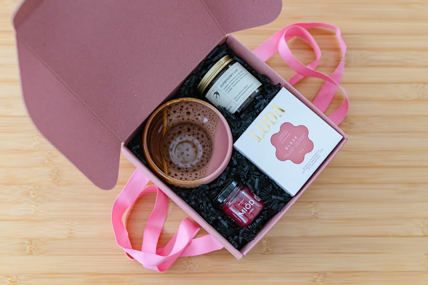 - Herbata kwiatowo-owocowa Blask od Luda, 40 g. W składzie: pokrzywa, liść porzeczki, róża płatki, malina liofilizowana, róża owoc liofilizowany, skrzyp polny, róża pąki – większość produktów pochodzi z polskich upraw. Smak naparu łączy słodycz i kwaskowatość malin z delikatnymi, różanymi nutami. W środku pudełka znajdziesz uroczy klips w kształcie kwiatka, którym można zamknąć torebkę z herbatą.